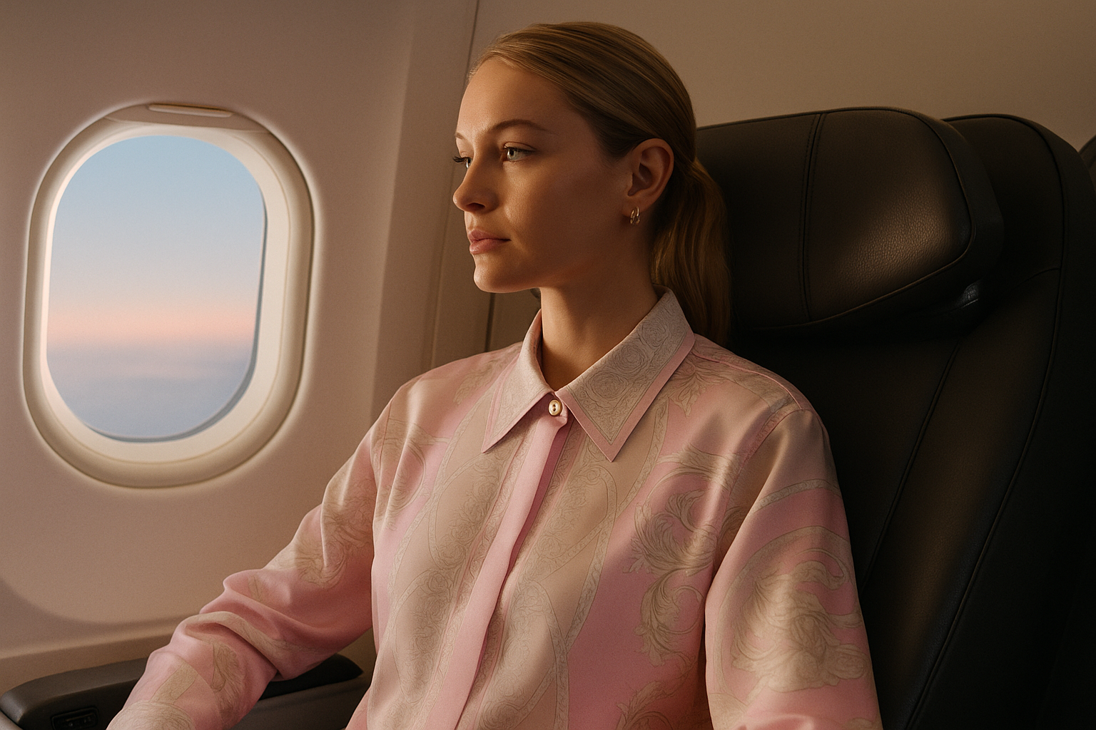 ejecutiva, la suavidad de tu camisa de seda acompaña la calma del despegue.